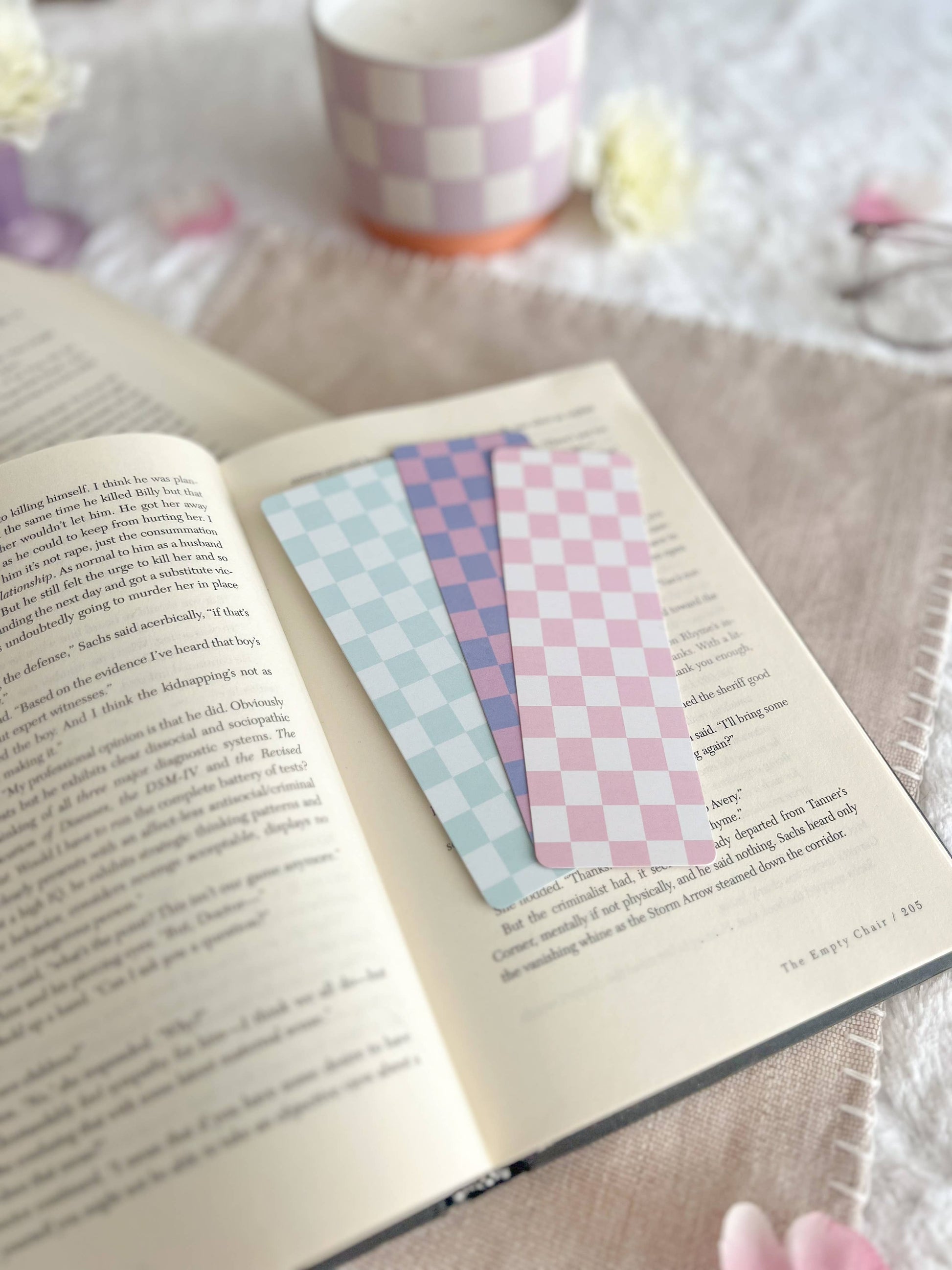 spring bookmark, checkered bookmark, pastel bookmark, pink checkered, aqua checkered, purple checkered
