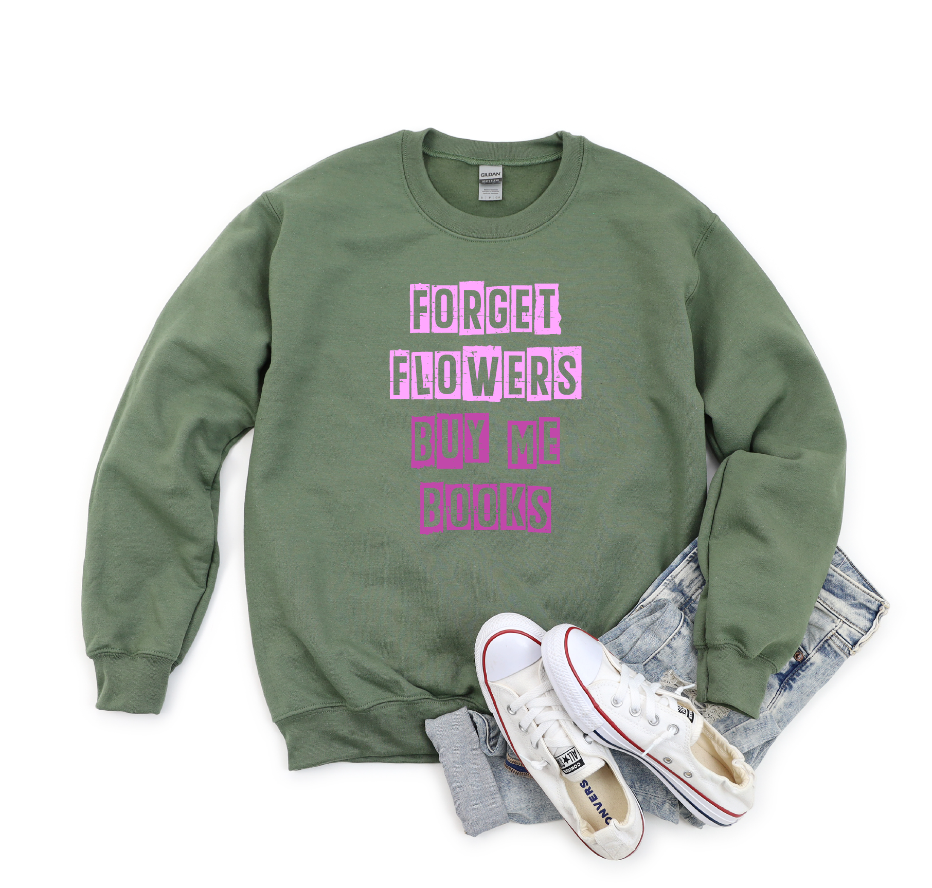 Forget the flowers—this design says it all for book lovers everywhere. Available on soft Gildan sweatshirts or Bella Canvas tees, both crafted from poly-cotton blends that are a breeze to care for and resist shrinkage. Perfect for anyone who'd rather curl up with a good read than anything else. Cozy, durable, and unapologetically bookish.