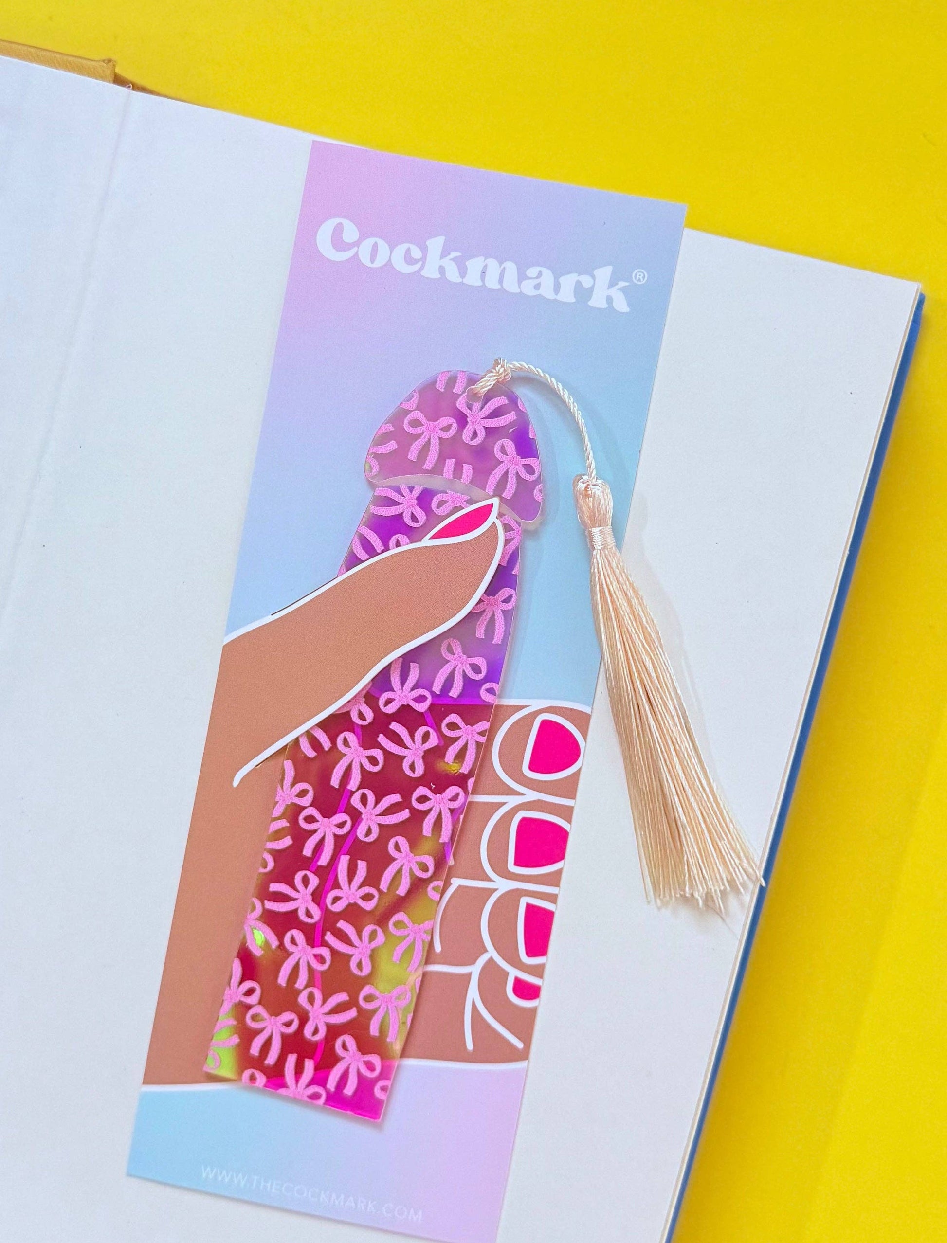 Have you been a good girl? Gorgeous pink holographic acrylic Cockmark with printed pink bows. Design is visible on both sides.Topped with splooging cream tassel.